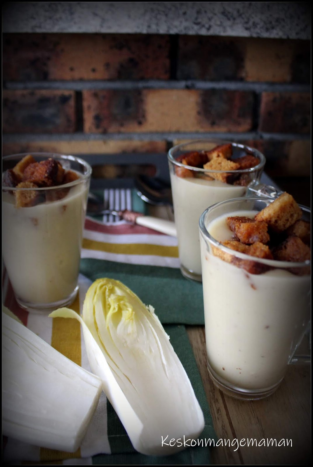 Je vous l'accorde l'endive n'est pas le légume le plus glamour qui existe , il est souvent boudé des enfants (et des papas d'ailleurs ^^ ) , mais l'endive possède plein d'atouts dans son jeu , et sa petite amertume (qui se souvient des endives ultra amère de son enfance ? ) est plutôt une bonne chose , en effet dans la nature toutes les plantes un peu amères sont le signe qu'elles sont dépuratives et bonnes pour votre foie et réguler votre transit, alors pour nettoyer un peu nos organismes encrassés en fin d'hiver rien de tel qu'un bon petit velouté d'endives .